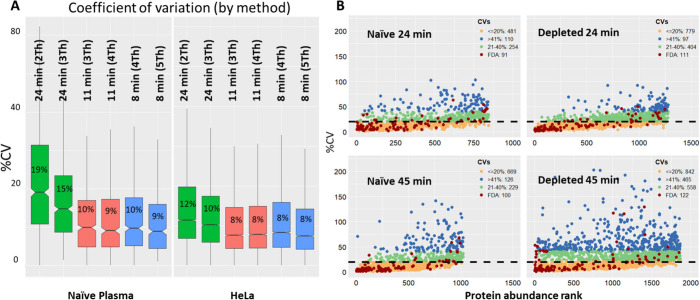 Quantitative reproducibility is strong, especially at shorter gradients. The reproducibility across HeLa injections was equally strong as more than 80% of proteins showed a coefficient of variation (CV) below 20%, a widely accepted benchmark for reliable quantification. Interestingly, shorter gradients produced tighter CV distributions than longer ones, likely because faster runs favor sharper chromatographic peaks. In naïve plasma, one of the most challenging sample types in proteomics — a 45-minute gradient still identified over 1,100 proteins with good quantitative precision. Between 91 and 122 FDA-approved circulating biomarkers were detected depending on the sample preparation and gradient length used, the vast majority were below 20% CV threshold (Fig 1). Even in naïve (undepleted) plasma — the most challenging condition — low-abundance markers including Mucin-16 (CA125), pancreatic triacylglycerol lipase (PNLIP) and CD36 were detectable.