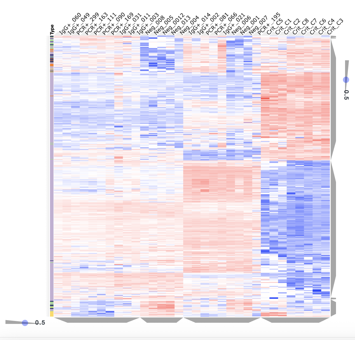 Clustergrammer Heatmap of ECFC Proteomics Across COVID-19 Severity Groups